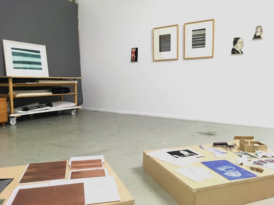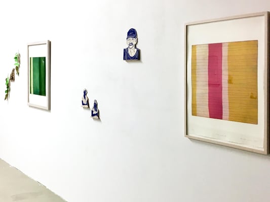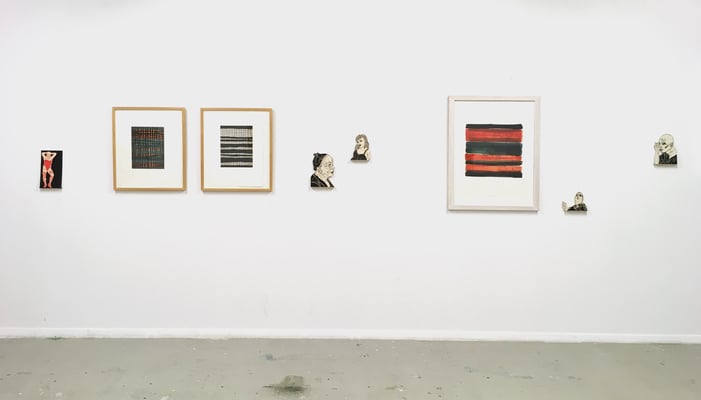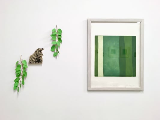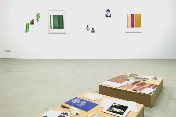 Ausstellungsansicht: Von der Linie zum Raum, 2021, Monika Humm: Aquatinta auf Bütten, Tatjana Utz: Linoldruck-Cutouts