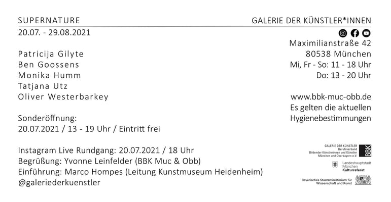 Das Ausstellungsprojekt SUPERNATURE, basierend auf Idee und Konzept von Monika Humm und Tatjana Utz, zeigt Arbeiten fünf zeitgenössischer Künstler*innen, die sich in ihren Werken auf völlig unterschiedliche Weise mit dem Thema Natur auseinandersetzen: