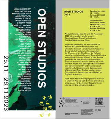 Ein Wochenende lang öffnet die PLATFORM ihre Türen und bietet Interessierten die Möglichkeit einen Blick hinter die Kulissen und in die Ateliers der Kunstschaffenden zu werfen. Die Atelierkünstler*innen arbeiten in den verschiedensten Bereichen, darunter Fotografie, Malerei, Grafik, Bildhauerei, Zeichnung, Mixed Media, Textilkunst, Soundart, Schmuckdesign und Medienkunst. Die Besucher*innen sind herzlich eingeladen die kreativen Arbeitsräume und deren Bewohner*innen kennenzulernen. Während der Open Studios werden Führungen (DE & EN) angeboten und in unserem Pop-up-Café kann sich nach dem Atelierbesuch mit einer Erfrischung gestärkt werden.